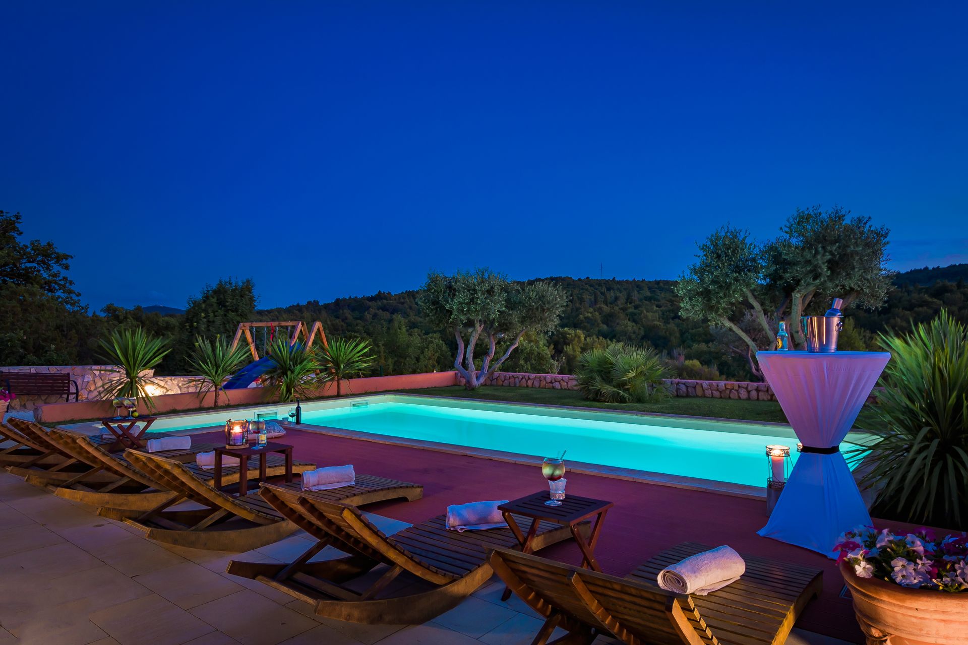 The upper floor opens onto the private roof terrace with loungers, as well as onto the separate balcony. You can recharge your batteries and enjoy the wonderful view of the forested nature as far as the Adriatic. The living room on the lower floor leads out onto the generous veranda with seating. You can enjoy the picturesque landscape over breakfast, or relax and immerse yourself in the world of books. The warm evenings invite you to use the grill provided. A little further down the slope there is a heated private swimming pool for your own exclusive use. The generous villa also offers three private outdoor parking spaces. Four bicycles are available for use free of charge.